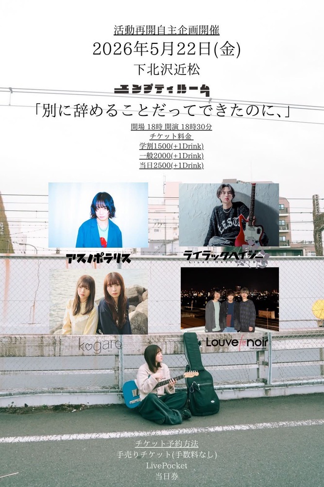 自主企画「別にやめることだってできたのに、」2026年5月22日に開催決定! SCHEDULE 2026/05/22(金) 18:30 - 下北沢近松 地図を表示 OPEN 18:30 出演バンド様 アスノポラリス/ライラックヘイジー/kogare/Louve noir/エンプティルーム チケットはこちらから! URLをコピーする 報告する